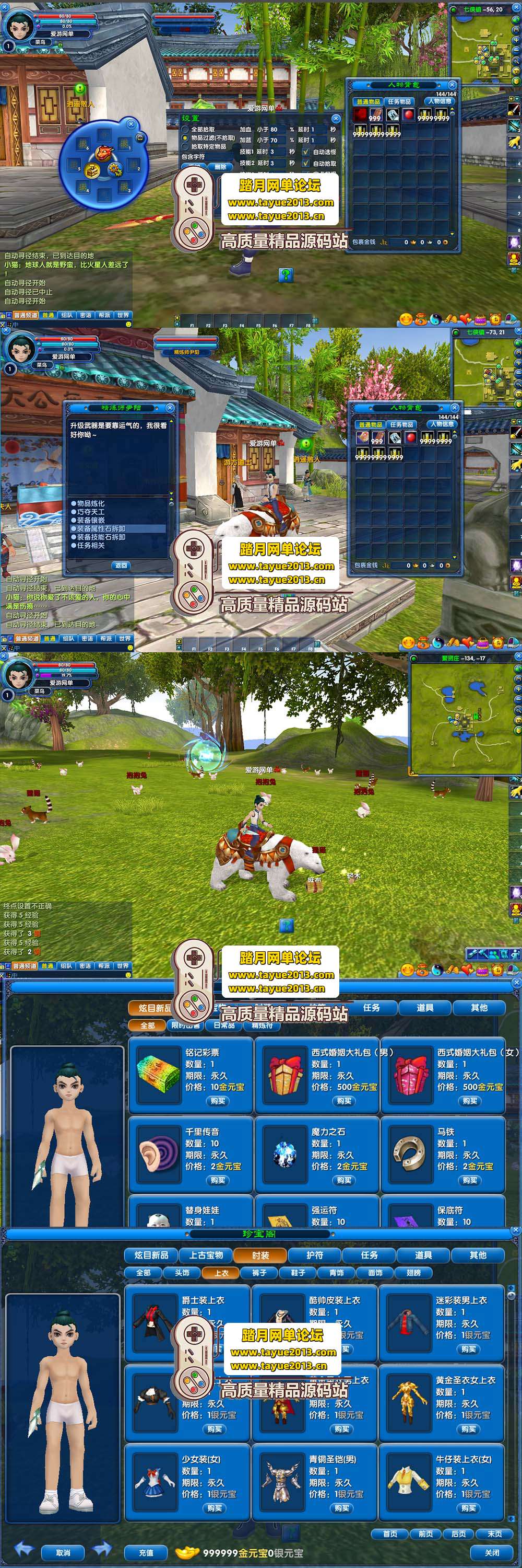 上线增加赠送白熊坐骑(无属性 7.0速度 你QQ空间的模型) 武林红人(图形称谓无属性) 新手武器改为150攻击 100防御 命中+999 5组1级9999个新手药