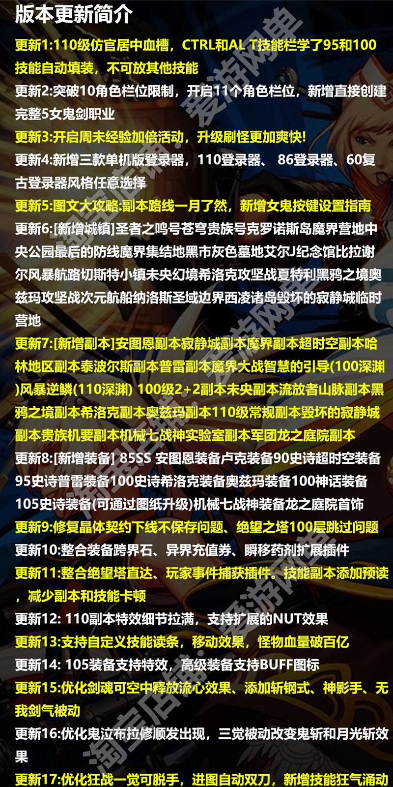 更新8:[新增副本]安图恩副本寂静城副本魔界副本超时空副本哈林地区副本泰波尔斯副本普雷副本魔界大战智慧的引导(100深渊)风暴逆鳞(1 10深渊) 100级2+2副本未央副本流放者山脉副本黑鸦之境副本希洛克副本奥兹玛副本110级常规副本毁坏的寂静城副本贵族机要副本机械七战神实验室副本军团龙之庭院副本