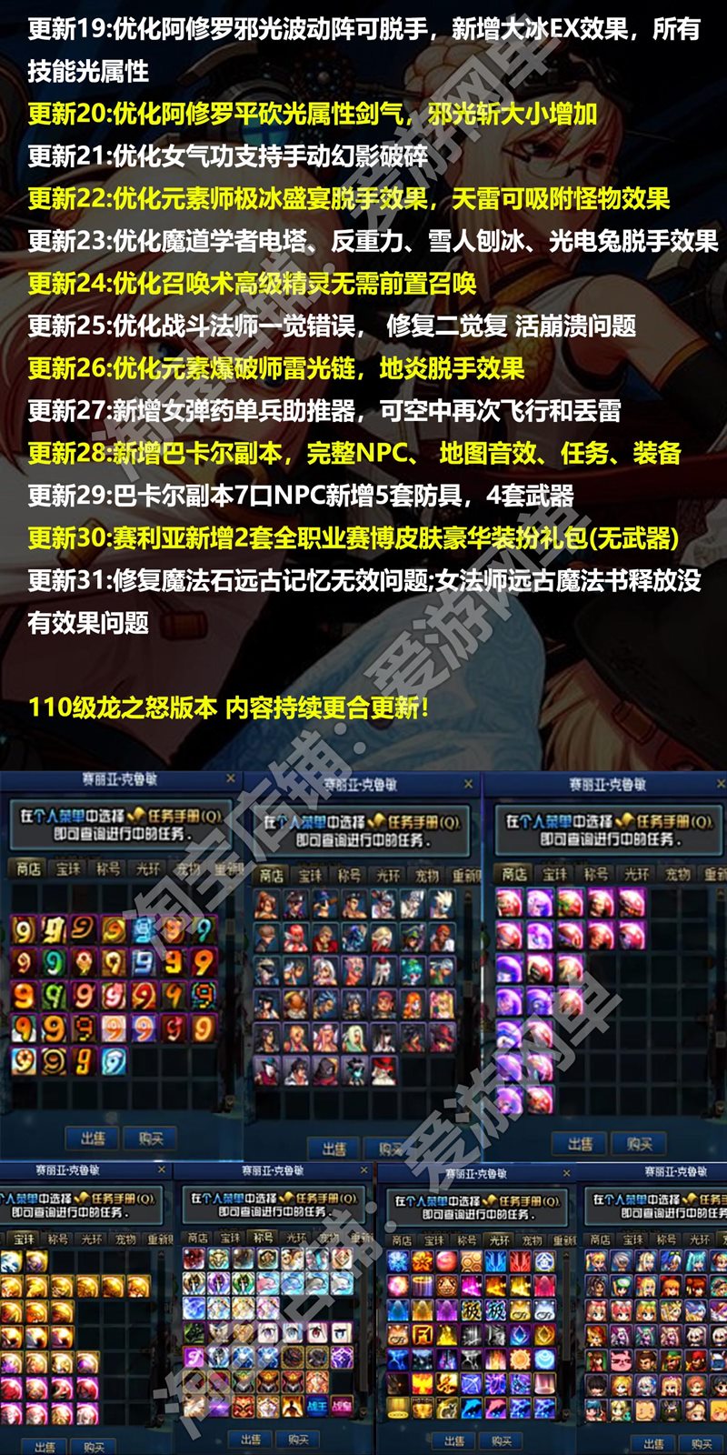更新9:[新增装备] 85SS 安图恩装备卢克装备90史诗超时空装备95史诗普雷装备100史诗希洛克装备奥兹玛装备100神话装备105史诗装备(可通过图纸升级)机械七战神装备龙之庭院首饰